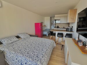 - Cuisine entièrement équipée (plaques, micro-ondes, frigo, cafetière…)